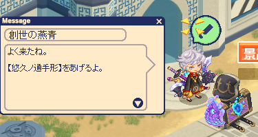 ウィステラの街で「創世の燕青」と話したあと、 ウエストガルドの「太陽の王都 エジプシアン」へ行こう。 「創世の燕青」は王都の北東にある館の前で君を待っているよ。 ミッションを受注するには【悠久ノ通手形】が必要になるよ。 1. 館の前で「創世の燕青」から館の説明を聞く 初回は「創世の燕青」に話しかけ、説明を聞き終えた際に 2. 1日1回「創世の燕青」に話しかける 初回の会話以降、館の前にいる「創世の燕青」に話しかけると ※【悠久ノ通手形】は1ID1日1回3枚受け取ることができます。 【悠久ノ通手形】は、プレゼントバッグに入ったままだと 【悠久ノ通手形】は、ミッションクリア時に1枚消費されます。 |