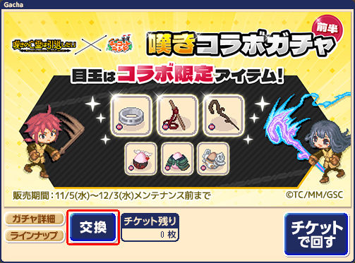 ※アイテムバッグに自動的に送られます。 ※荷物がいっぱいの際には、プレゼントバッグに送られます。 ※「嘆きコラボガチャ前半」をまわすことでも「嘆きガチャコイン」を入手できます。