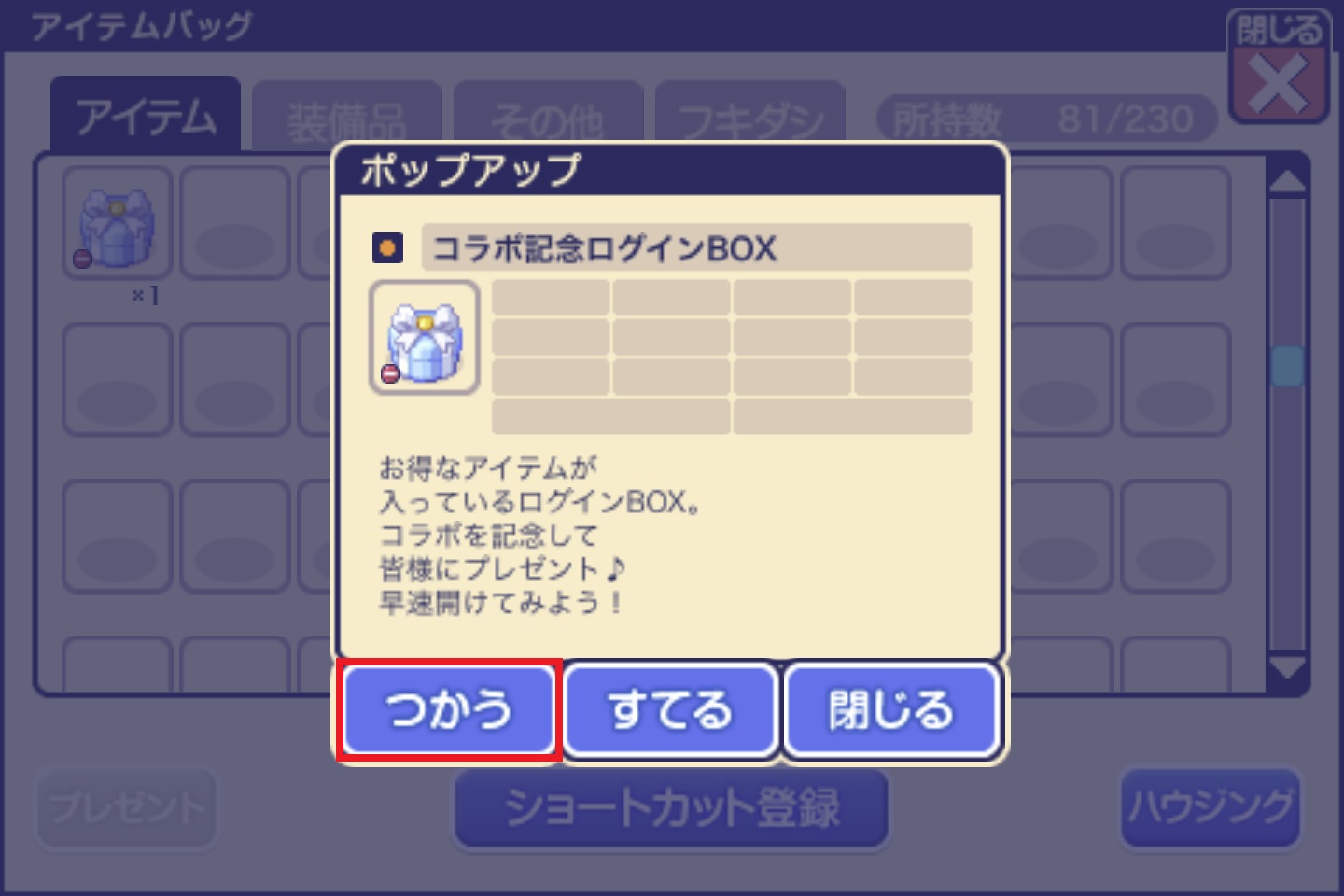 (複数の日をまたいだ後に更新した場合は、次の日のアイテムが配布されます)