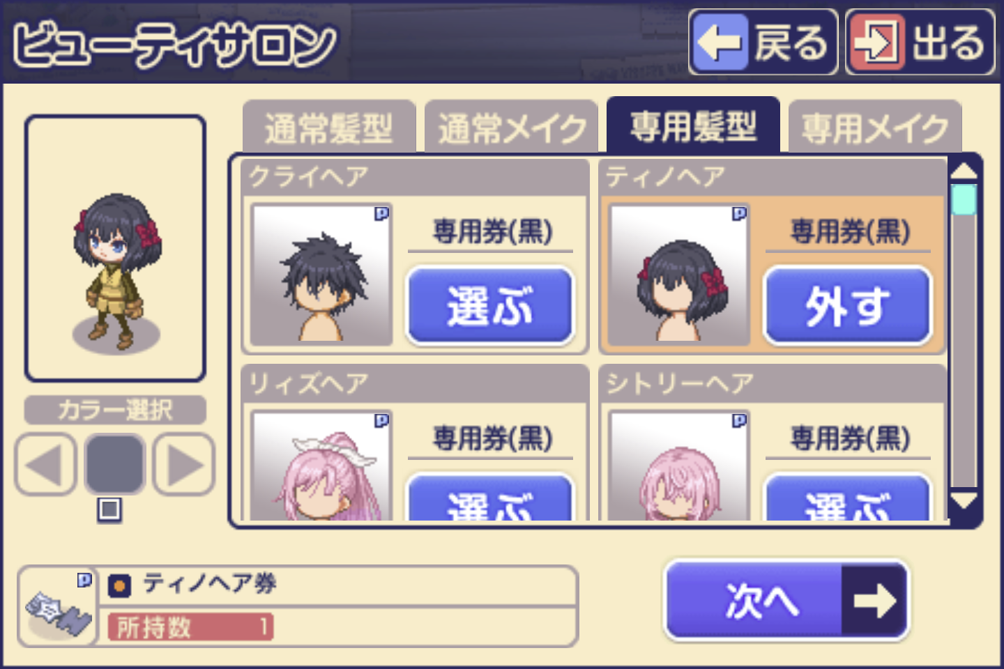サロンを開いたら「専用髪型」「専用メイク」タブを選択!