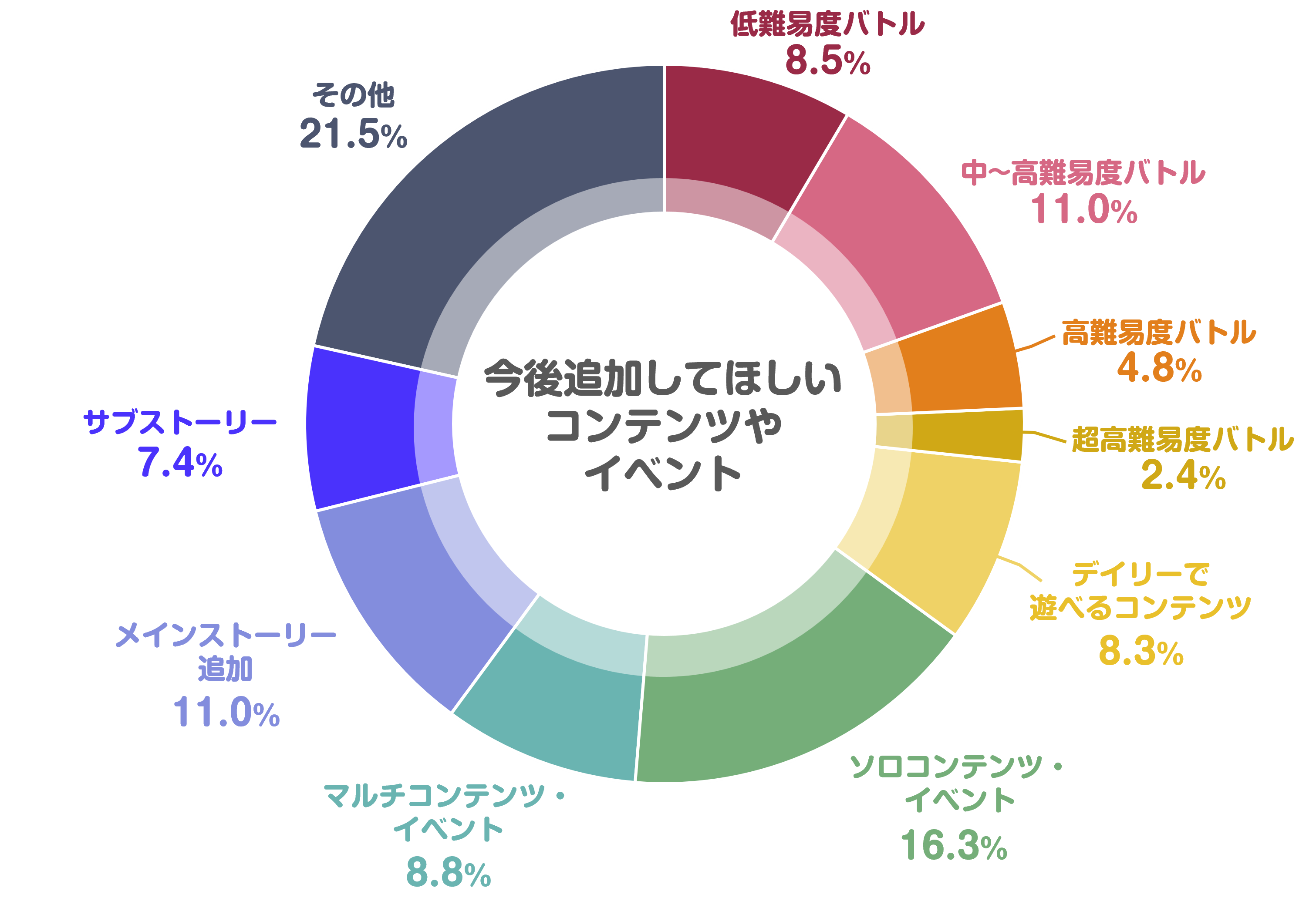 | 低難易度バトル :「幻影と創造の間」程度 中~高難易度バトル:「修行(秘伝スキル)」~「侵蝕坑道」程度 高難易度バトル :「パーセナ神殿」程度 超高難易度バトル :「パーセナ神殿-極-」程度 その他 内訳 ・謎解き要素が多いイベント ・全プレイヤー協力型のレイドバトル ・常設捕獲マップの追加 ・ローグライクコンテンツ ・コラボイベント ・カジノコンテンツ |