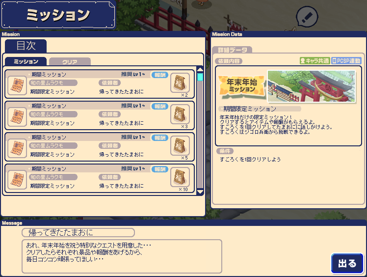 | 【アイテムについて】 ・アイコン左下に「 」マークのあるアイテムは、取引不可となります。・アイコン右下に「 」があるアイテムは男性キャラ専用、「 」があるアイテムは女性キャラ専用となります。【ペットについて】 ・おしらせに掲載されているパラメータは、合成を行って育成した成長の一例です。 【特殊コアについて】 ・パラメータの上昇/減少に幅のある特殊コアについては、 錬成成功時、範囲内の数字がランダムで付与されます。 【クエストで入手できる経験値について】 ・すごろく「モンスター対決マス」のクエスト報酬に 記載される経験値はアシスターの効果を受けません。 【祈願について】 ・攻撃向上祈願、防御向上祈願の効果時間中に、 同効果の祈祷/アイテムを使うと、上書きになります。 ・成長祈願、大成長祈願の効果時間中は、 同様の効果祈願/アイテムは、使用できません。 【神力について】 ・年末年始イベントで獲得できる神力は 聖宝の神殿セントレイジアで使用できる神力とは異なります。 【すごろくマップに出現するモンスターについて】 ・すごろくマップに出現するモンスターは捕獲できません。 ・すごろくマップに出現するモンスターは 通常出現するモンスターから一部調整されています。 ・一部のクエスト報酬や、ドロップアイテムなど、 前回から調整されているものもございます。 【イベント終了後の出現アイテム変更について】 ・「チョコット福袋【午/2026】」はイベント期間限定で使用できるアイテムです。 2026年1月14日(水)メンテナンス終了以降に使用すると 『スカチケット』のみ出現するようになります。 【年末年始イベントに伴う、一部クエストの受注不可について】 ・年末年始を「ムラクモ神社」での実施に伴い、 イベント期間中は下記クエストの受注およびクリアができなくなります。 クエスト名:結婚指輪を作るために! クエスト名:自然を愛する心 ※年末年始イベント終了後より受注/クリアができるようになります。 【過去プレイ済みのユーザーについて】 ・過去年末年始イベントをプレイしたことがあるお客様につきまして イベント進行状況は神力値を含め、全て初期化されています。 【錬成について】 ・アイテムの性質上、錬成に失敗する場合があります。 また特殊コアは一度装備品に錬成すると、 特殊コアの状態に戻すことはできません。 ・錬成の成功、失敗に関わらず、 強化コアや装備保護コア、特殊コアは消費されます。 ・装備保護コアは、錬成レベルⅣ以上から使用することができます。 ・強化コアの錬成に失敗すると、強化値が下がります。 ・1つの装備には、2種類以上の強化錬成 または特殊錬成を行うことはできません。 ・強化錬成または特殊錬成を施した装備は、 クエストのクリア条件や、合成素材として使用できなくなります。 ゲーム内マネーで購入可能な強化解除コアを使用し、 強化前の状態に戻すことで、クエストのクリア条件や、 合成素材として使用可能になります。 ・強化解除コアは使用時に消費されます。 ・特殊錬成は、「Ⅰ」⇒「Ⅱ」⇒「Ⅲ」・・・と 段階を踏んで行う必要があります。 詳細は コチラ 【イベント終了時の回収アイテムについて】 ・2026年1月14日(水)メンテナンス時に、下記アイテムを回収します。 伝説の福餅 チョコット福袋【2026】 おみくじ【大吉】、おみくじ【中吉】、おみくじ【吉】 おみくじ【凶】、おみくじ【大凶】 チョコボーロギフト【限】、チョコボーロミニ【限】 チョコボーロミニミニ【限】、ブニャペットエッグ【限】 ペトキューブ[LV+1]【限】、ペトキューブ[POW+1]【限】 ペトキューブ[INT+1]【限】、ペトキューブ[SPD+1]【限】 ペトキューブ[VIT+1]【限】、ペトキューブ[LUK+1]【限】 ペトキューブ[HP+20]【限】、ペトキューブ[SP+20]【限】 チョコビタ【POW】【限】、チョコビタ【INT】【限】 チョコビタ【SPD】【限】、チョコビタ【VIT】【限】 チョコビタ【LUK】【限】 【画像について】 ・一部画像はPC版を参照しております。 |