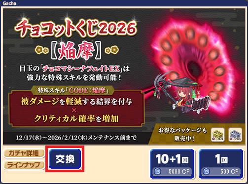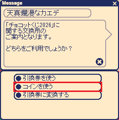 チョコットくじ【焔摩】チョコットくじ【羅刹】どちらの利用でも 同一のコインを獲得することができます。 【交換場所】