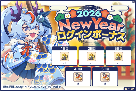 | <2026 New Year ログインボーナスについて> ・ルーム内へ入室後、プレゼントバッグに配布されます。 ・配布アイテムは1ID1回のみの配布となります。 (受け取り後にキャラクターを再作成してもアイテムは配布されません) ・ログインしたまま日をまたいだ場合は、掲示板の「ログイン」をクリックするか ルームの再入室で更新することによってアイテムが配布されます。 (複数の日をまたいだ後に更新した場合は、次の日のアイテムが配布されます) <アイテムについて> <画像について> |