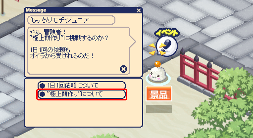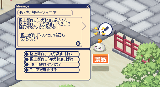 | 「餅つき語り!受け継がれる職人魂」をクリアすると もっちりモチジュニアの景品交換所がオープンするよ。 「伝説の福餅」は「もっちりモチキング」を倒した際に プレゼントバッグに配布されるから 忘れずにチェックしてね!