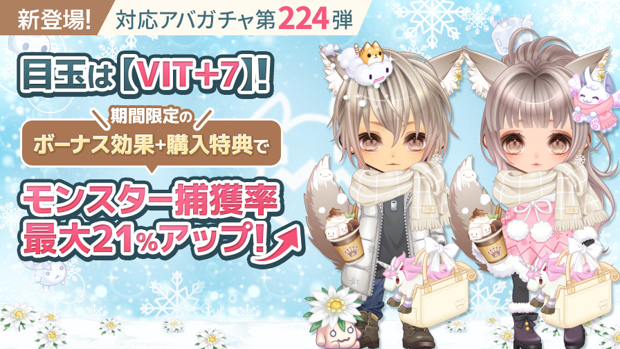 | 身に着けると、ゲームの中で強くなれちゃう不思議なアバターアイテム! コーデガチャの 「もふもふスノーホリディ」シリーズ を モチーフにしたアバターアイテムが登場♪ 期間限定のボーナス効果+購入特典でモンスター捕獲率最大21%アップ! 【販売期間】 ガチャの目玉アイテムは