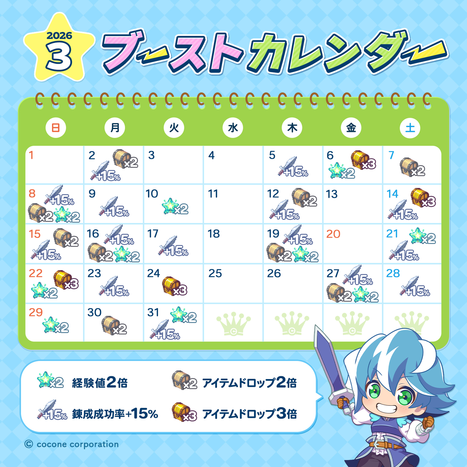 | チョコットランド19周年を記念してブースト開催! 経験値2倍とアイテムドロップ2倍/3倍が 合わさったスペシャルデーも! カレンダーをチェックしてね♪ |