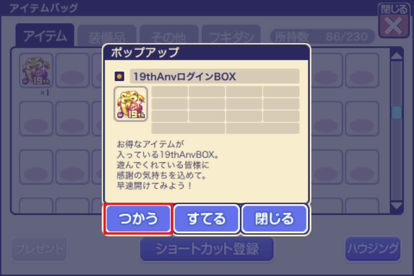 | 19thAnvログインBOXをGETできたら開けてみよう! メニューバー>バッグ で「19thAnvログインBOX」を選択後 ◇ 出現アイテム一覧 ◇
